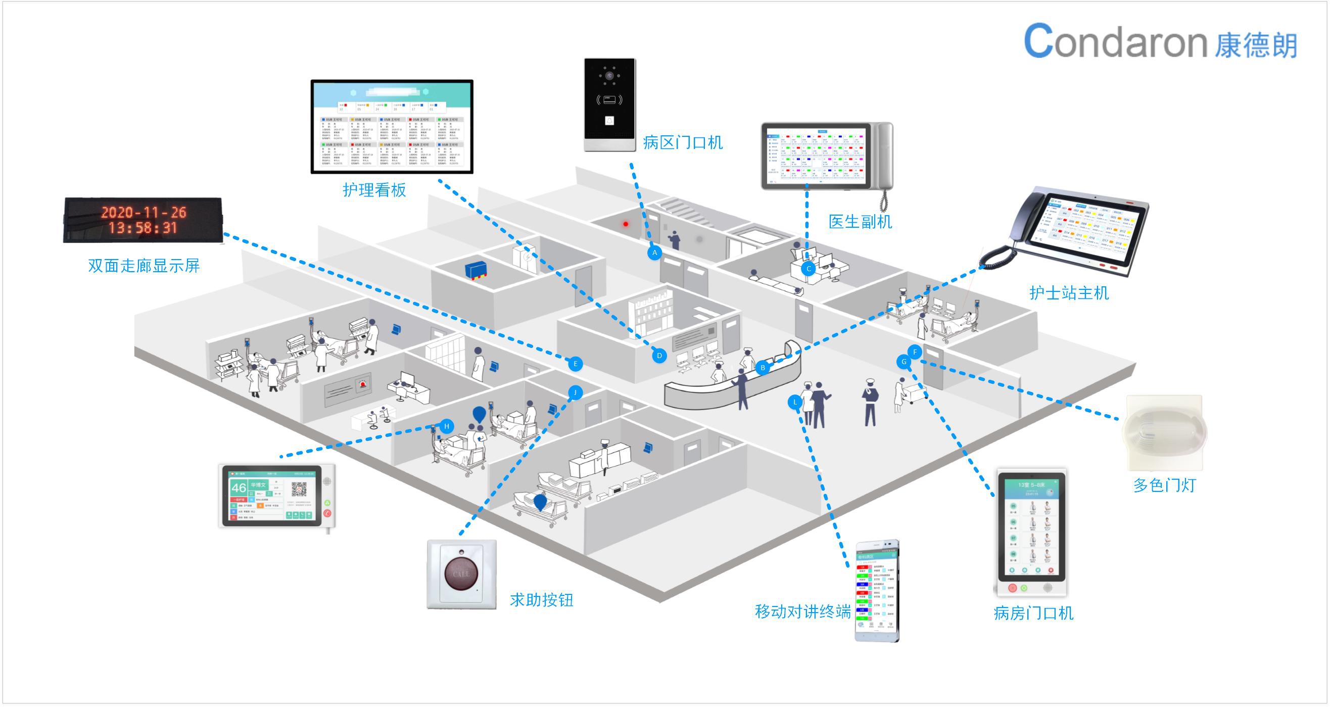 病房門(mén)口:病房門(mén)口主要部署病房門(mén)口機(jī)、三色門(mén)燈等設(shè)備。